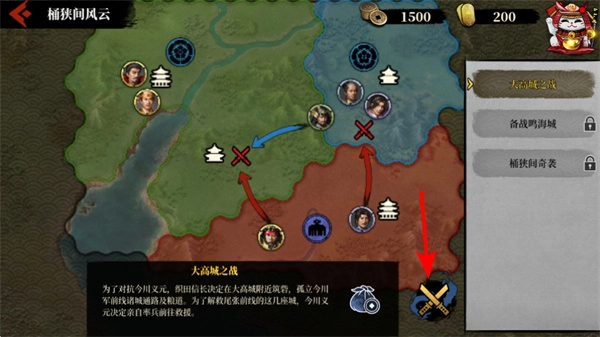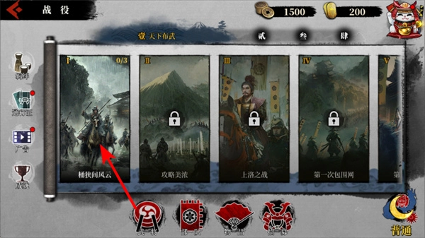 2、进入战役界面后,选择已解锁的关卡(例如桶狭间风云),这是开启对应历史战役的核心操作,不同关卡对应着不同的战场环境与战略目标。