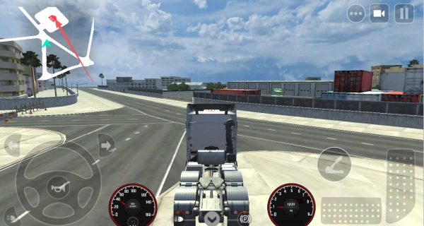 驾驶过程中,请留意左上角的地图,牢记红色箭头所指示的目的地,借助虚拟方向盘和油门来操控车辆的行驶方向与速度,沿着规划路线准确到达任务指定地点。