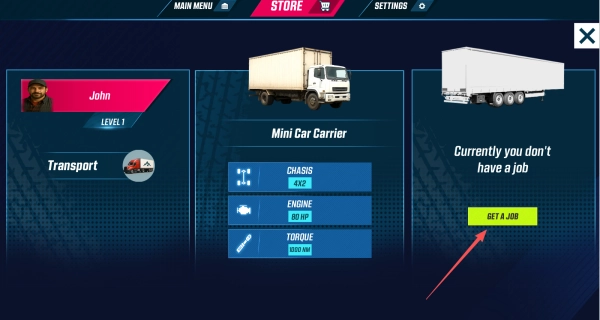 在商店界面,点击右侧的“GET A JOB”按钮来领取运输任务,这是推动游戏进程、获取资源的重要环节。