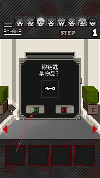 1、在当前界面出现银钥匙物品的提示时,点击绿色对勾样式的确认按钮,即可获取该银钥匙道具用于后续的关卡互动。