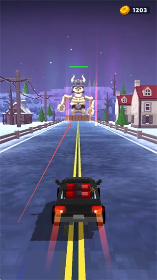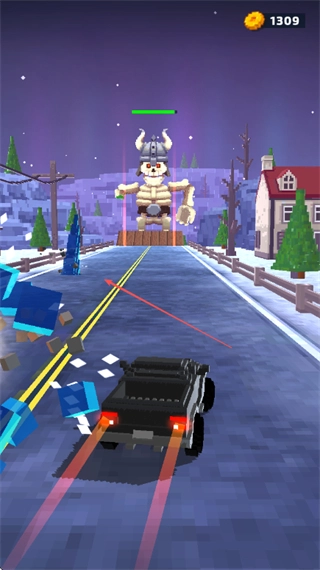 1、驾驶车辆在赛道上行驶,朝着巨型敌人如骷髅巨人前进,发射攻击。