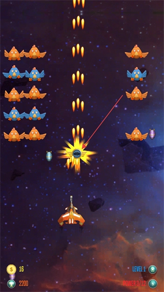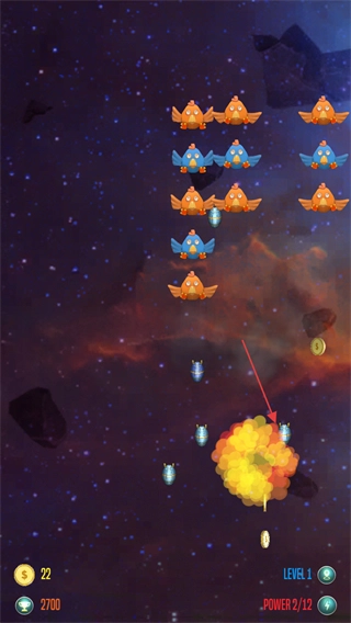2、击败小鸡后会随机掉落金色升级道具,拾取该道具后可对飞机进行升级,从而提升其攻击力。