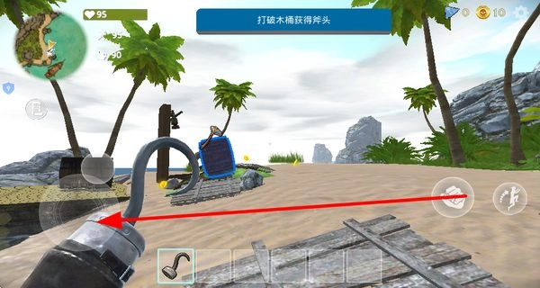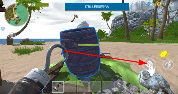 2、找到木桶并将其破坏,从中获取斧头工具,以便为后续砍伐树木、收集资源等操作做好准备。