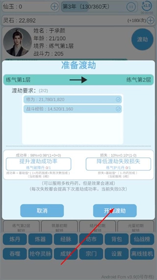 2、进入准备渡劫界面,确认渡劫要求已满足后,点击开始渡劫,尝试提升境界。