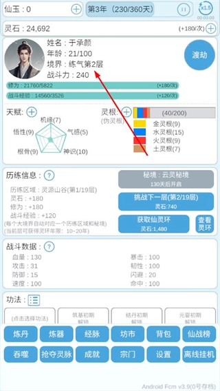4、渡劫成功后,回到主界面,可看到自身境界、战斗力等属性得到提升,继续积累修为和战斗经验,为下一次渡劫做准备。