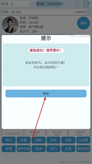 3、渡劫成功后,会弹出提示界面,点击确定,即可确认境界提升,继续修仙之路。