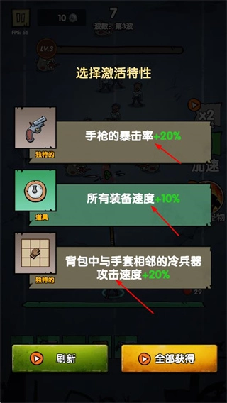 3、战斗结束后,可选择激活提升手枪暴击率、加快装备速度、强化冷兵器攻击速度等特性,以此进一步增强自身的战斗能力。