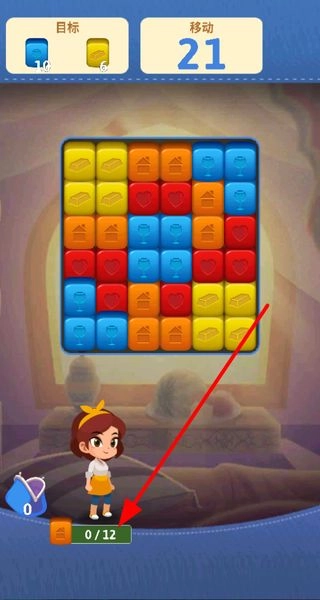 4、上方显示目标和移动次数,下方能查看当前收集进度,需在规定移动次数内收集足够数量的目标方块。