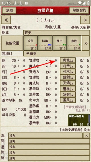 2、查看成员详情,在成员详情界面中,查看Anton的职业、技能、属性等信息,了解成员的能力特点,为任务分配提供依据。