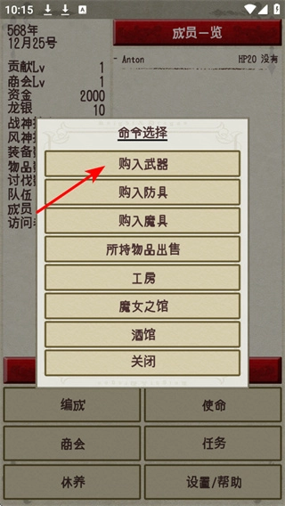 3、挑选采购类别,在指令选择页面里,点击购买武器的选项,进入武器采购界面,给成员配置适宜的武器,增强他们的战斗能力。
