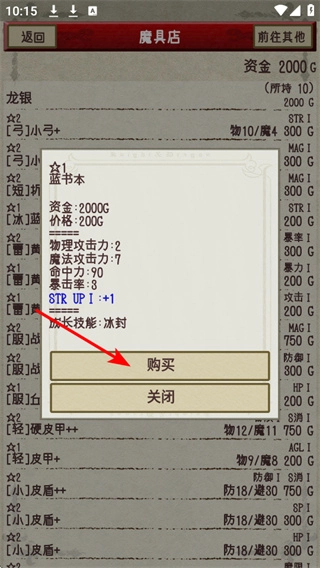 4、购买魔具道具时,可进入魔具店界面,点击购买按钮,选购蓝书本之类的魔具道具,以此提升成员的属性与技能效果,为推进游戏进程提供帮助。
