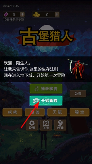 1、在游戏里点击开始冒险”就能进入地下城挑战,进入之前可以查看游戏的功能选项,为即将开始的冒险做好准备。