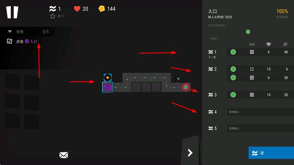 1、点击紫色入口,开启敌人波次进攻,这是触发防御战斗的关键操作,开启塔防挑战之旅。