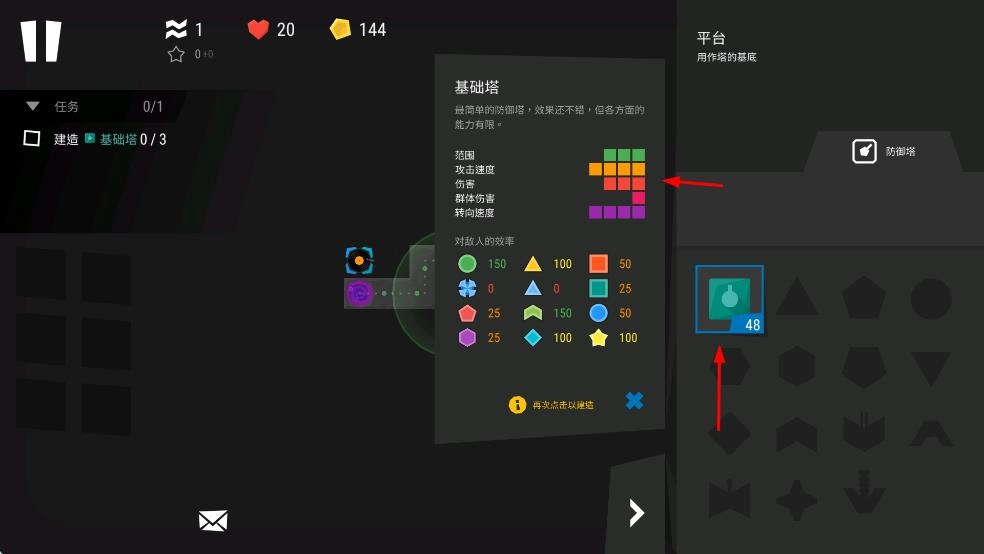 2、花费资源建造基础塔,利用其攻击范围、伤害等属性抵御敌人,为保卫区域奠定基础。