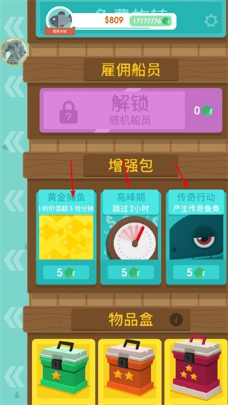 4、使用绿宝石购买增强包,可提高钓鱼收益、加快游戏进度或解锁传奇鱼类。