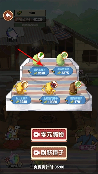 3、挑选种植用的种子,在种子选择界面里,选定适宜的种子,明确好要种植的作物种类。