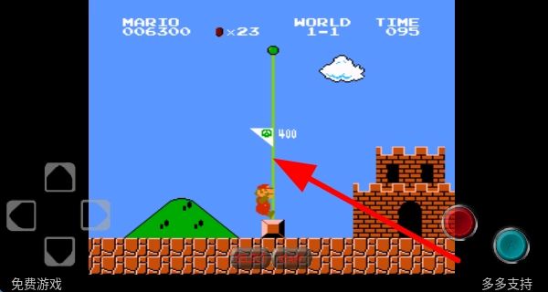 2、当遇到绿色旗杆时,操控马里奥进行跳跃并触碰它,不仅能获得分数奖励,还能朝着关卡终点前进,从而完成当前关卡。