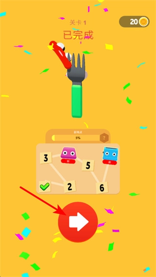 2、关卡完成后,点击红色继续按钮可进入下一关,继续前需关注本关获得的金币数量,为后续关卡积累资源。