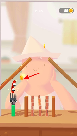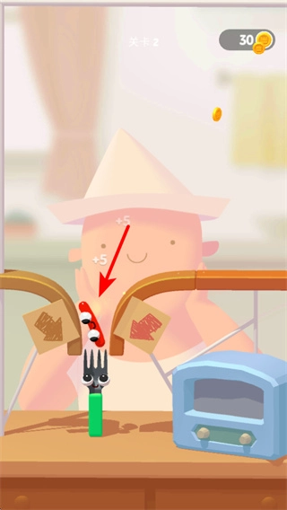 3、游戏中利用叉子等道具的助力,让小虫沿箭头方向跳跃,跳跃时需把握时机,确保小虫能安全到达目标位置。