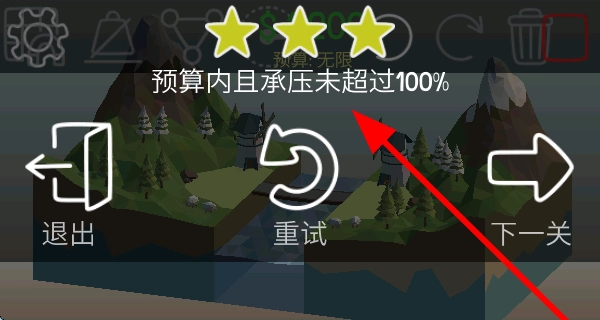 3、若桥梁在预算内且承压未超100%,就能获得三星评价,之后可选择进入下一关继续挑战。