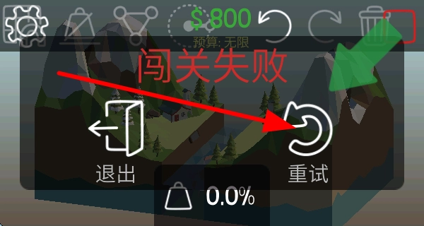4、要是闯关失败,可点击重试按钮,重新设计建造桥梁,不断尝试,直到桥梁能成功让车辆通行。