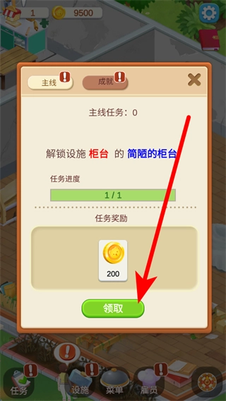 1、首先留意任务界面,主线任务会引导解锁关键设施,比如解锁简易柜台这类任务,完成后点击领取,可得到金币奖励,帮助餐厅建设。