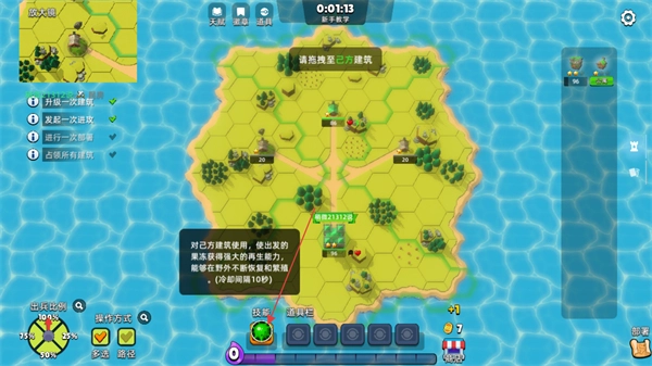 1、在岛屿上升级建筑,提升史莱姆部队实力,积累资源。
