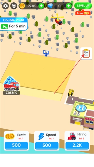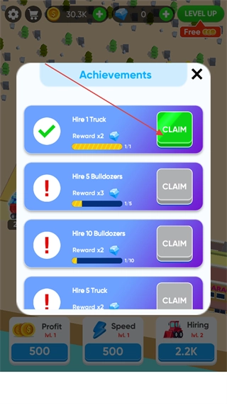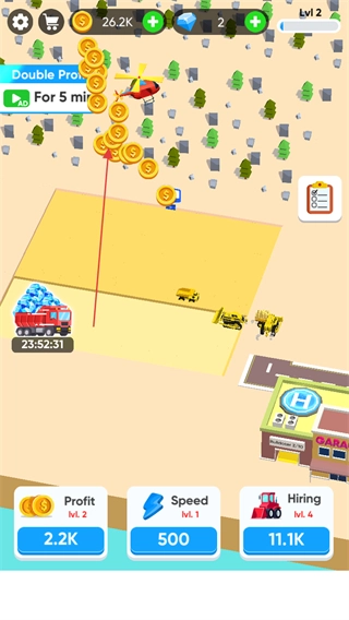 3、使用已获取的金币,点击下方的Hiring按钮,雇佣推土机等更多设备,以提高挖掘效率。