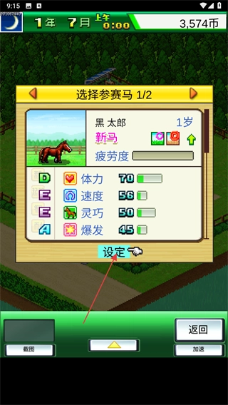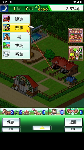 1、游戏主要就是培育马匹参加比赛提高牧场知名度,点击菜单栏中的赛事查看当前的赛事计划。