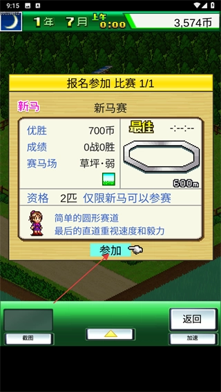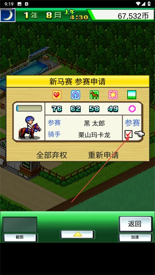 3、报名需要选择参赛马,根据马匹的各项属性评分进行选择合适的马参加比赛。