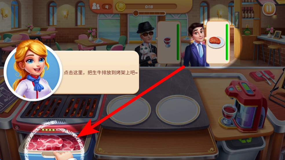1、进入后,了解店铺内的食材和厨具位置,当有顾客前来时,查看顾客需要的食物,比如牛排等,准备好对应的食材。