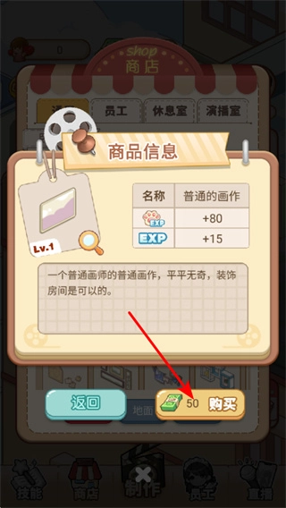 3、进入商店界面后,点击普通画作这类装饰道具,能够查看它们的属性与功能,这是提升店铺装饰等级的关键步骤。