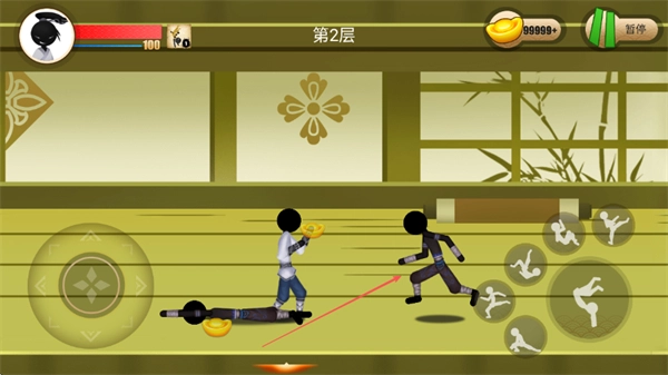 1、在第2层场景中,操控角色移动,攻击黑色敌人,可拾取敌人掉落的金币。