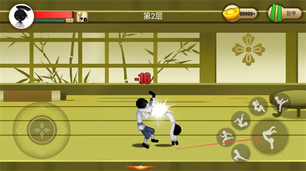 3、使用右侧技能按钮如踢击类技能,对敌人造成伤害如-16,丰富攻击手段。