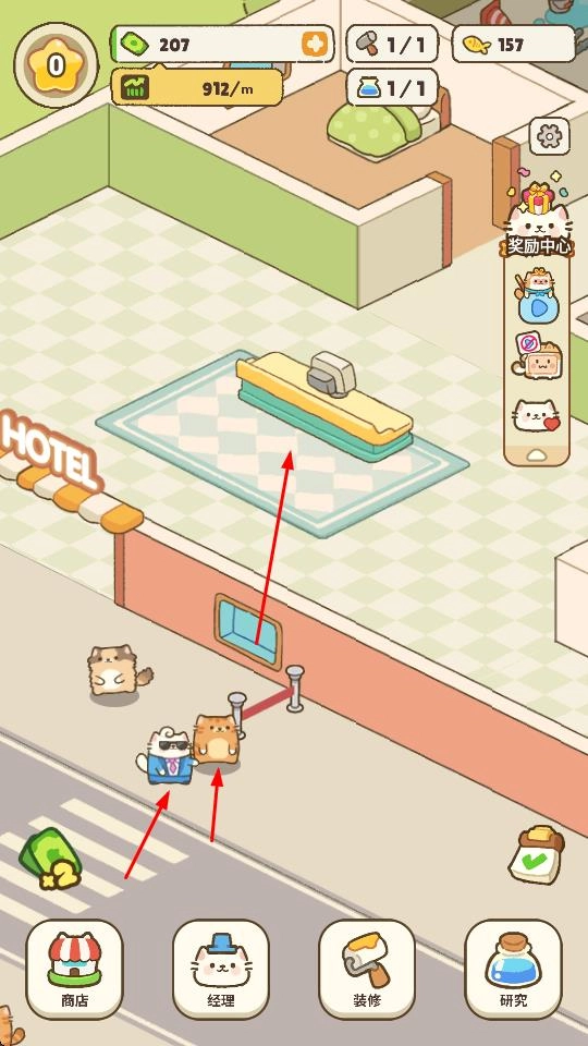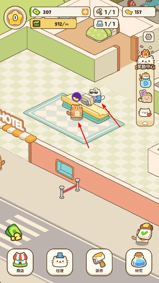 4、通过经理功能辅助酒店运营,持续接待更多猫咪客人,积累金币,逐步扩大酒店规模,打造更完善的猫咪酒店。