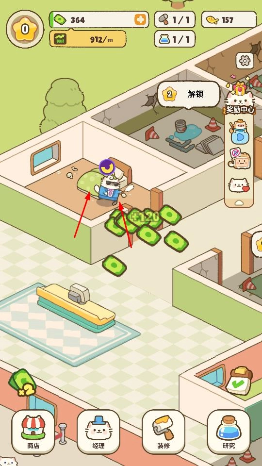 3、利用商店、装修、研究等功能按钮,对酒店设施进行升级,还能解锁新的客房区域,提升酒店接待能力。