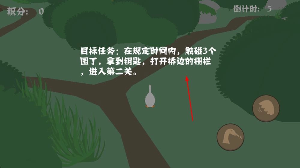3、找到园丁后,控制白鹅靠近并接触他,完成接触任务来得到钥匙,期间要注意倒计时,妥善安排移动的时间。
