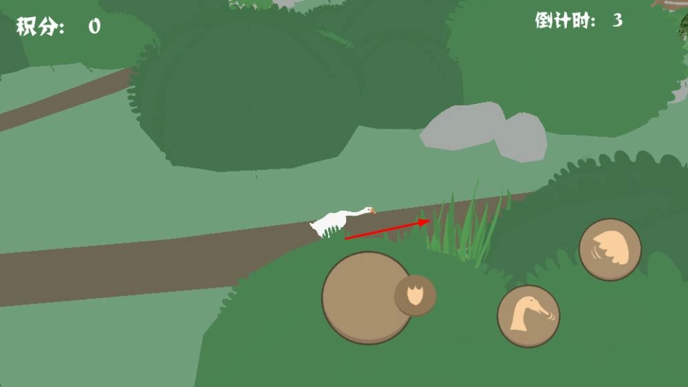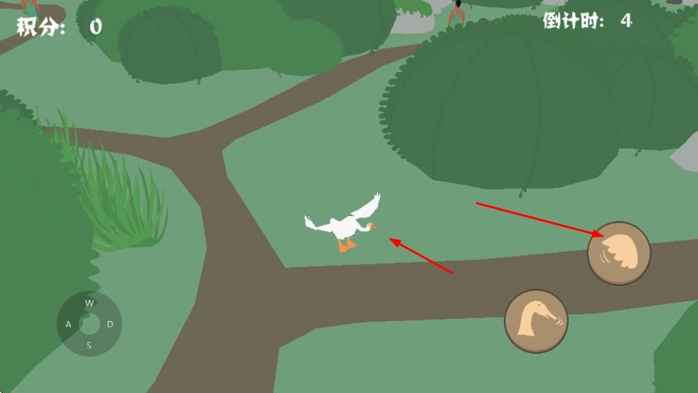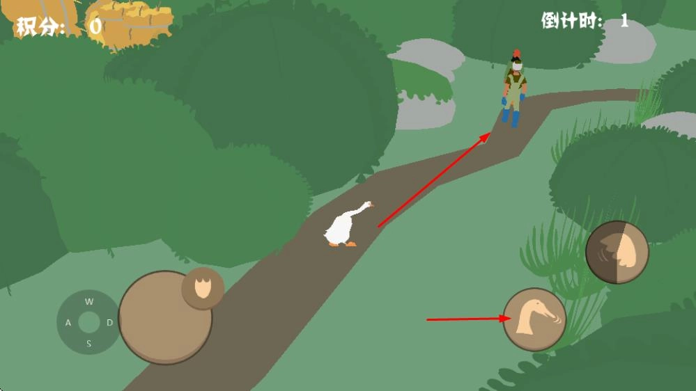 2、借助右侧的操作按钮来操控白鹅在林间小路上移动,让它灵活地在草丛和路径之间穿梭,去寻找园丁所在的位置。