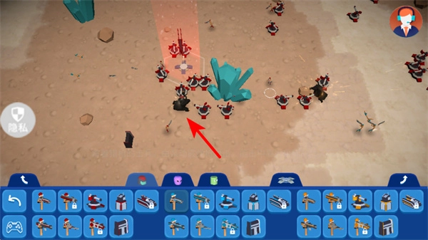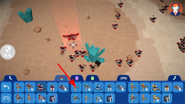 3、依据战场态势,再次点击底部栏里其他单位的图标,比如红色箭头所指的武器图标,挑选作战单位,补充兵力以应对敌方的进攻。