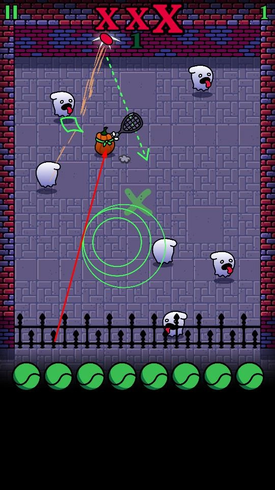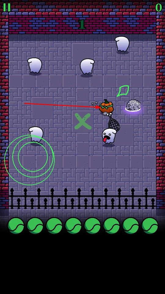 2、通过滑动或点击操作,让南瓜头挥拍击打网球,利用网球弹射、直线轨迹,瞄准游荡幽灵,注意幽灵移动规律,提前预判击球,成功击中可击退幽灵。