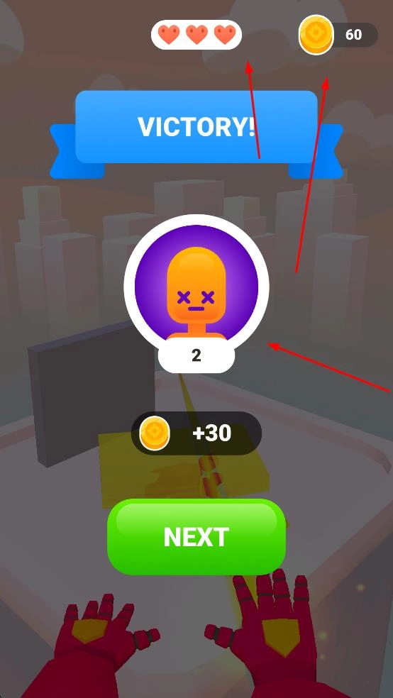 3、留意上方显示的关卡、生命值和金币数量等信息,当完成当前关卡后会显示胜利界面。