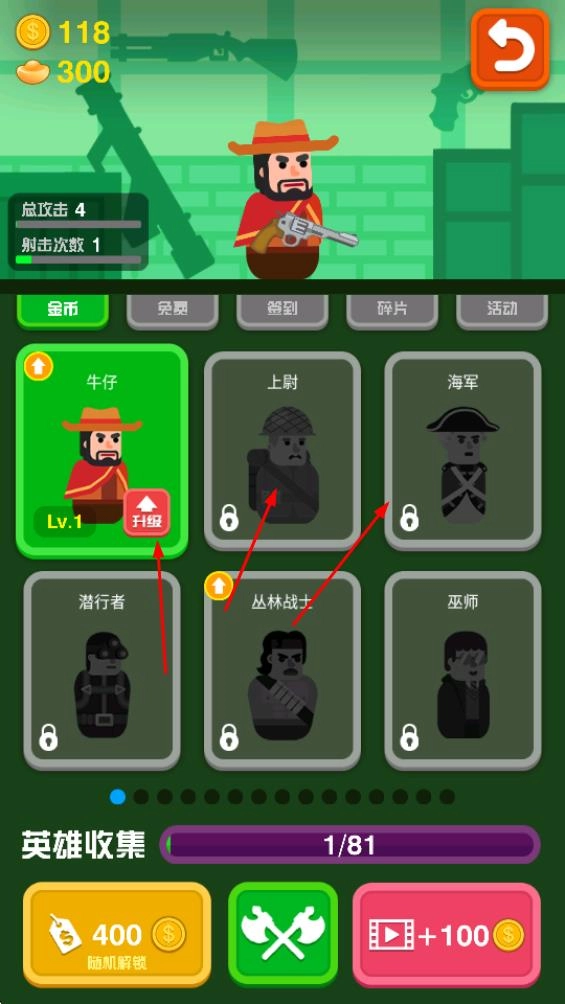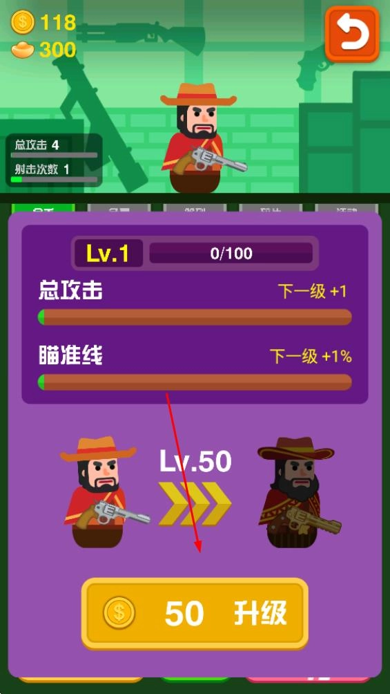 2、在英雄收集界面,可解锁牛仔、上尉等不同角色;选择角色,消耗金币升级,提升总攻击、瞄准线等属性,增强战斗能力。