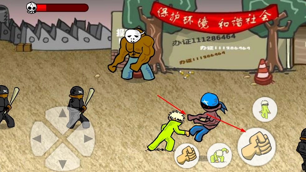 1、通过方向键控制角色移动,在场景里灵活变换位置,点击拳头按钮发动攻击,来对付持械的敌人,开启格斗对决。
