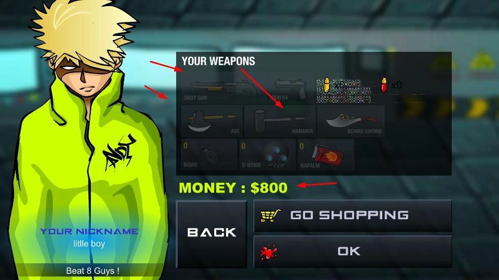 3、战斗结束后能够进入武器界面,查看自己拥有的霰弹枪、斧头、锤子等各类武器,还可以用战斗中获得的金钱去GO SHOPPING购买装备。