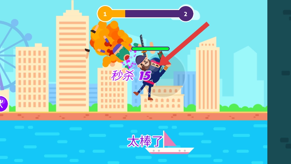 1、角色忍者等造型可触发秒杀15高伤害效果,同时能积累3连击4连击combo,战斗过程中伴随爆炸、角色击退等视觉特效。