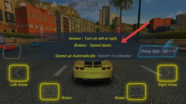 1、参照游戏的教程提示,通过左侧Left Arrow、右侧Right Arrow控制转向,下方Brake键减速,赛车自动加速。