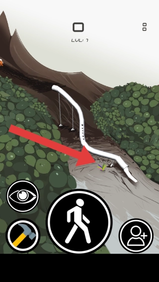1、界面上的功能按钮与场景风格清晰可辨,场景设定为野外山林环境,其中包含管道与植被元素,红色箭头所指的管道下方区域,是可供交互的点位或是任务的目标位置。