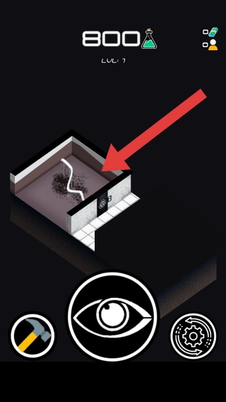 3、画面下方设有操作按钮,其中锤子可用于破坏类操作;整体呈现俯视视角的室内场景,场景中存在一道裂缝,这是需要玩家留意或进行操作的关键元素。