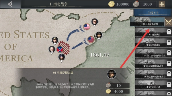 2、在战役选择页面中选择南北战争章节,然后点击主线关卡中的01马那萨斯会战,即可进入该场战役进行战斗。