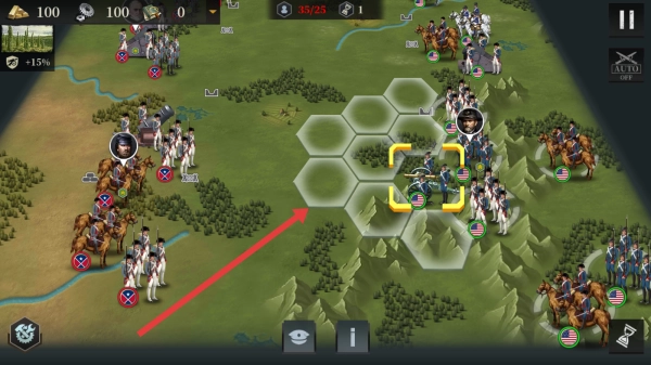 3、在战斗场景里,按照箭头的指引,把部队移动到指定的六边形区域,以此部署兵力来推进战役的进程。